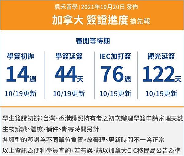 加拿大簽證審理時間更新 2021/10/20
